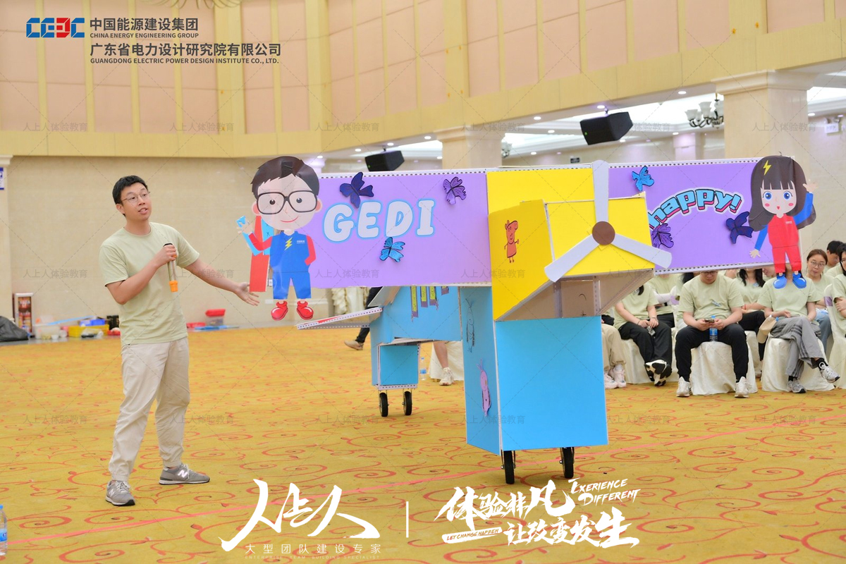 午饭过后,纸飞机的蓝图已在会场舒展。两组人围拢成圈,钢铁螺丝在手中流转,精准咬合出机身的骨架,彩笔在机身上勾勒出星河与电网的轮廓。当四架飞机汇聚,仿佛四座微型的能源图腾。代表们依次讲述设计巧思,最后所有人分散站定,用身影拼出 “GEDI” 四个字母,与四台飞机共同定格在航拍镜头里 —— 这不仅是合影,更是一群人与一份事业的郑重约定。