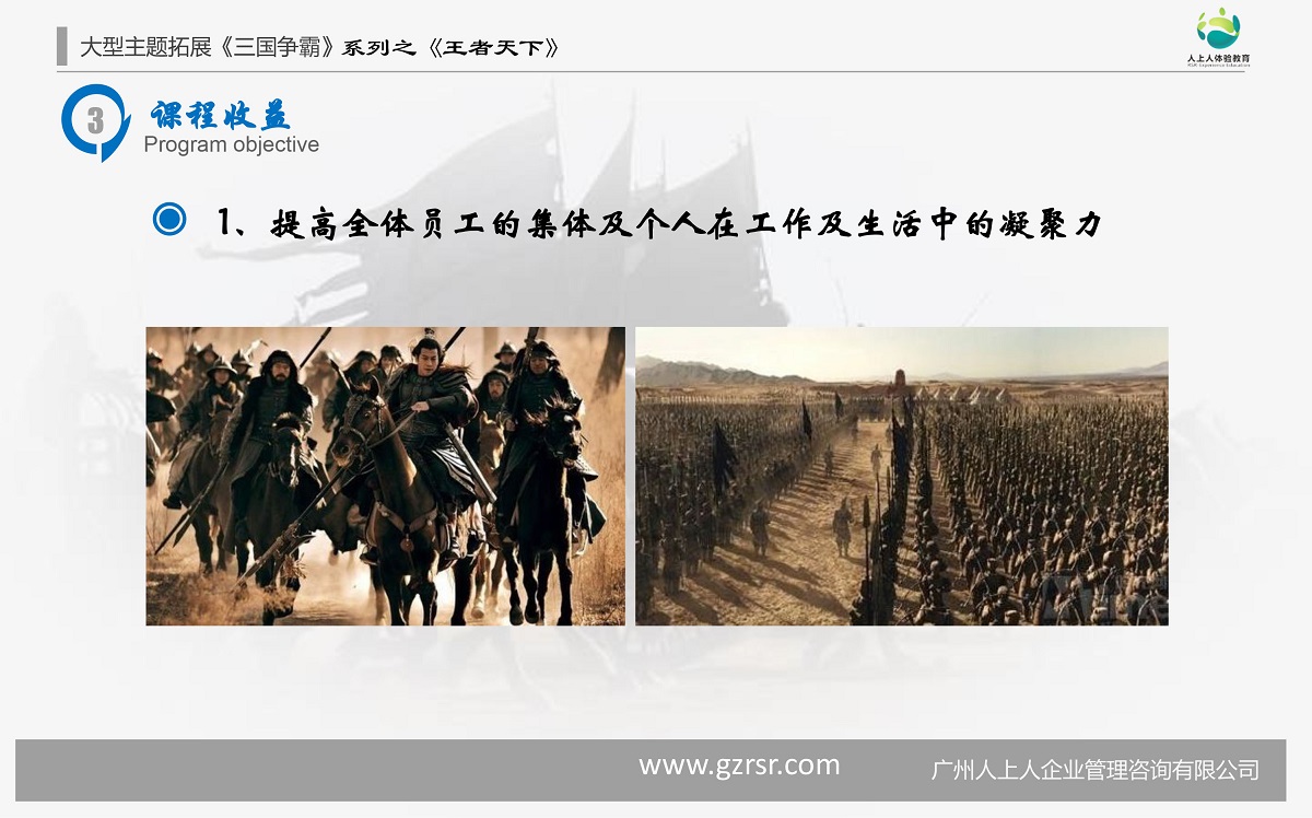 人上人体验教育《王者天下》大型拓展培训课程,是以古代商战为背景,由忠勇而智慧的企业精英战士组成的多个国家进行的龙争虎斗的活动。课程设计独特,布局周全,每一个活动的环节都紧紧相连,相辅相成,每一名队员都能充分的融入活动中来,让参与者身临其境,达到忘我的境界。《王者天下》问世以来,得到了参训单位的广泛认可与一致好评。对参与者的合作能力、领导能力、决策能力、智力都具有相当的挑战,为各参训单位提供了一种反映历史生活与户外拓展相结合的全新培训题材。